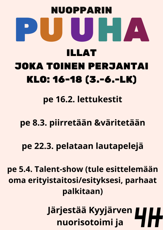 Lapset ja nuoret 09.02.2024 Karstulan-Kyyjärven 4H-yhdistys ry Päivi Heinonen Puuha-illat jatkuvat... Nuopparin puuha-illoissa tiedossa lettukestit, piirtämistä ja värittämistä, lautapelien pelaamista ja talent-show. Talent-showssa pääset esittelemään taitosi/oman esityksesi muille ja parhaat palkitaan. Jaa sosiaalisessa mediassa Aihealueen yhteistyöyritykset