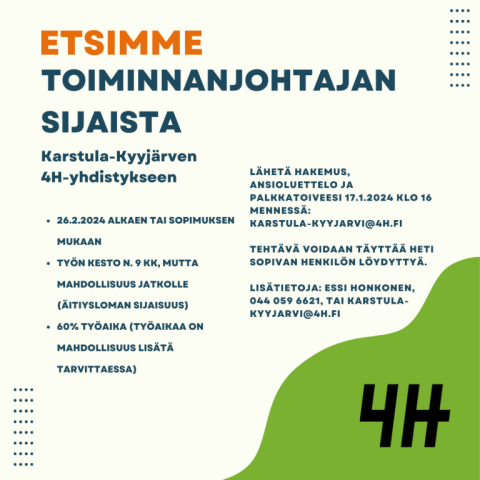 Haetaan toiminnanjohtajan sijaista 4H-yhdistykseemme.