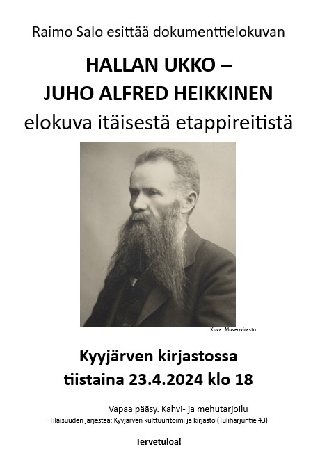 - Raimo Salo esittää dokumenttielokuvan: Hallan Ukko - Juho Alfred Heikkinen: elokuva itäisestä etappireitistä tiistaina 23.4. klo 18. Kahvitarjoilu. Tilaisuuden järjestää Kyyjärven kulttuuritoimi ja kirjasto.