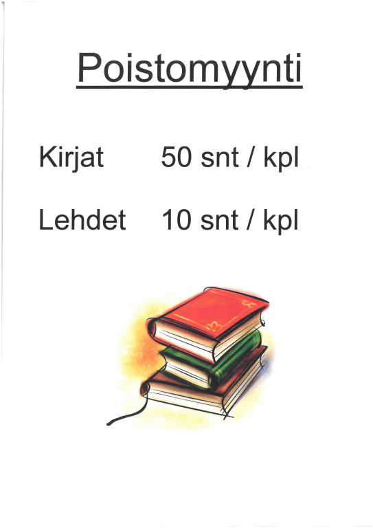 - Poistomyynti alkaa ke 10.4. klo 10.00. Kirjaston kokoelmasta on taas poistettu aineistoa, joten on poistomyynnin aika. Hinnat tuttuun tapaan edulliset:
