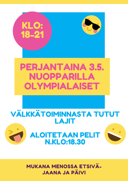 Lapset ja nuoret 23.04.2024 Karstulan-Kyyjärven 4H-yhdistys ry Päivi Heinonen Leikkimieliset olympialaiset nuopparilla perjantaina 3.5.! Menossa mukana Jaana-etsivä ja Päivi. Aloitetaan pelit n.klo:18.30. Jaa sosiaalisessa mediassa Aihealueen yhteistyöyritykset
