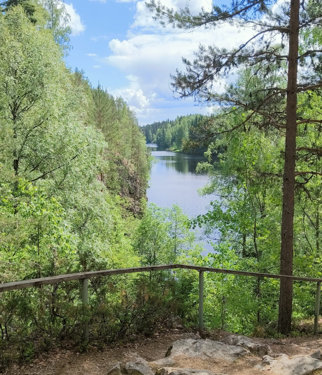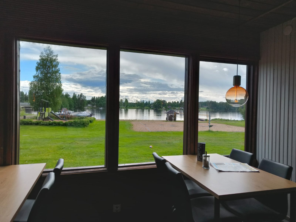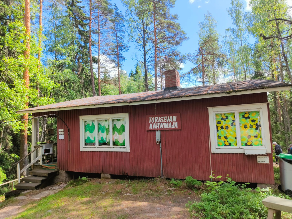 Perinnekylän jälkeen pakotti jo kahvihammasta ja apua haettiin Torisevan kahvimajalta. Kun tultiin pihaan, näimme kahvimajasta vain takapuolen ja ajattelin kyllä, että ollaanko nyt tultu väärään paikkaan!!?? Mutta kyllä siinä takaseinässä selvästi luki: TORISEVAN KAHVIMAJA. Piti vielä selvittää pieni temppurata yli puiden juurten ja kivien, mutta kun sen selvitti (eikä pudonnut rinnettä alas!), aukenikin hieno näköala Alaisen Torisevan rotkojärvelle. Itse kahvila on yli 85 vuotta vanha ja sen on perustanut aikanaan Lotta Svärd -järjestö. Se oli autenttisuudessaan hyvin viihtyisä ja yllättävän tilava.
