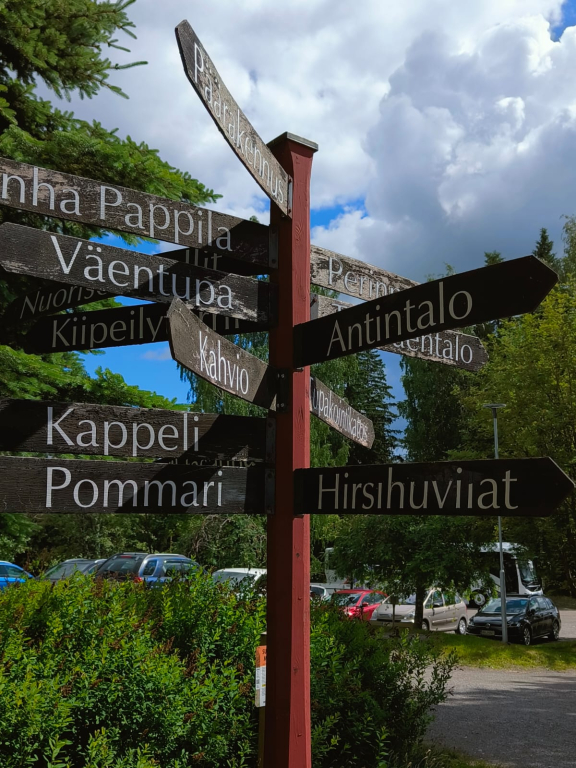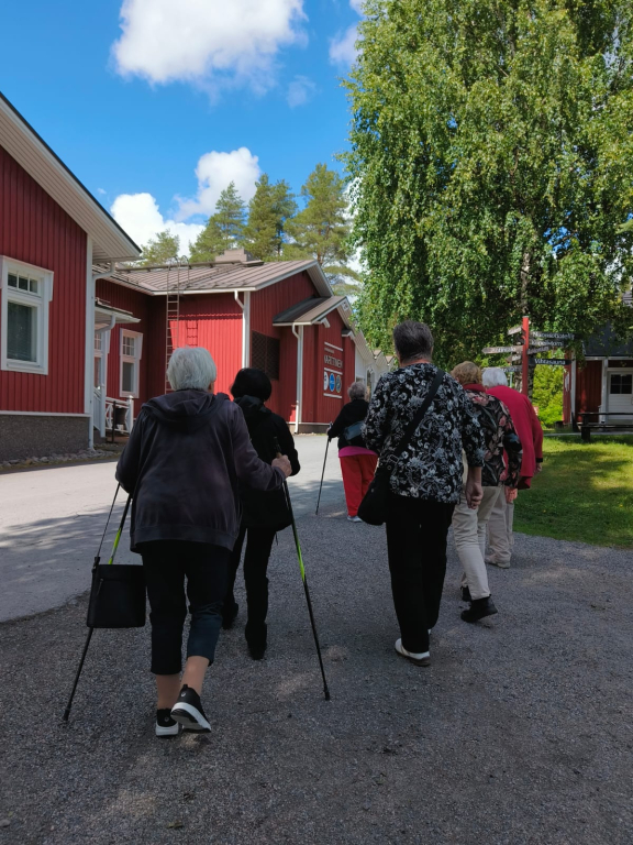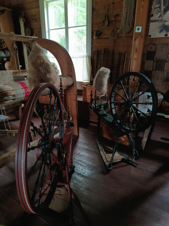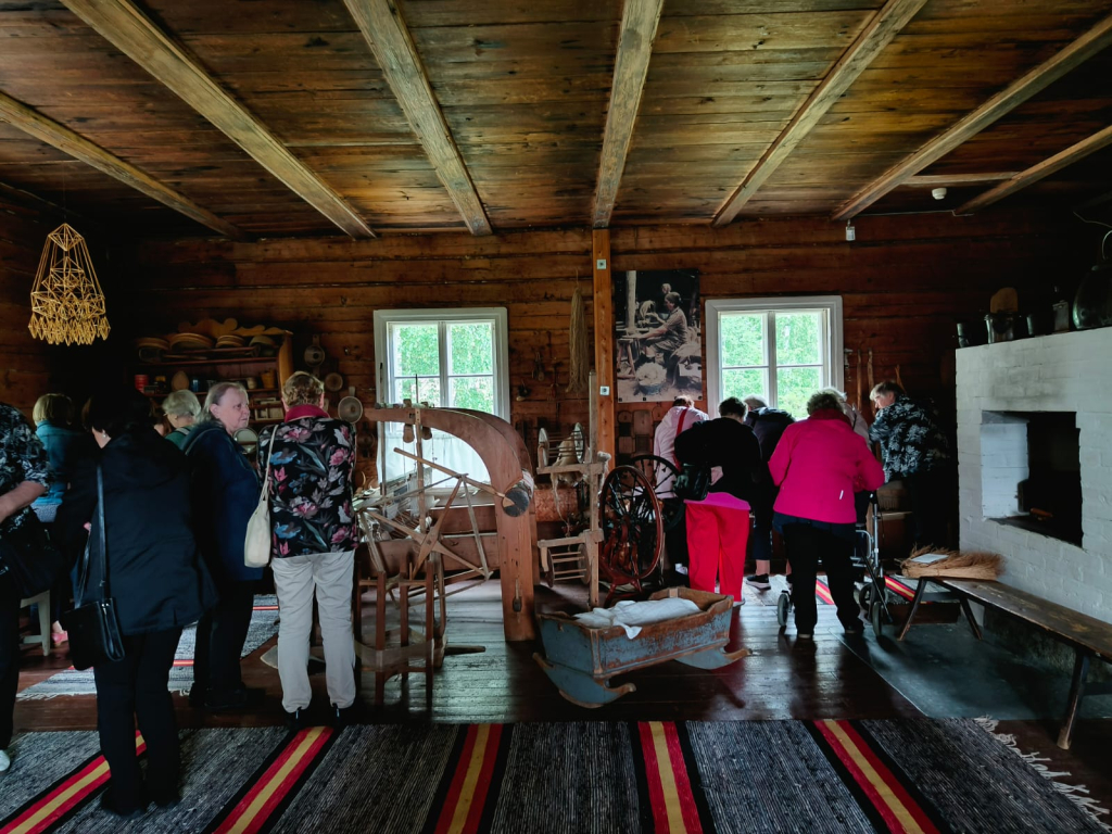 Seuraavaksi tutustuttiin Marttisten perinnekylään. Siellä oli meille kaikille nuorille tuttuja tavaroita: vanhoja työkaluja, tuohitöitä, patoja, kahvipannuja, rukkeja ym. Olipa myös Kitusen Martin pöytä! Marttihan oli kuuluisa karhun kaataja (yli 100 täysikasvuista karhua!), joka eli 1700- ja 1800-lukujen vaihteessa Virroilla. Perinnekylän opas kertoi, että Martti oli nuorena hintelä mies. Martin isä arveli, että ei pojasta ole maatalon isännäksi, kun siinä tarvittaisi vähän ruumiillista voimaa. Niinpä Martti ohjattiin polttopuita keräämään metsään, mutta loi siellä sitten uran karhunkaatajana.