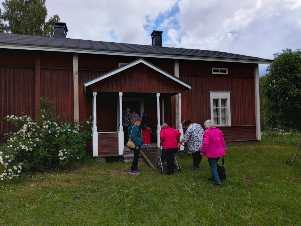 Kirkosta lähdimme Killinkosken tehtaalle. Siellä tutustuimme nauhamyymälään ja kirpputoriin. Monet tekivät hyviä kauppoja! Minäkin ostin kirjaillun pöytäliinan, vaikka kaappeja pitäisi alkaa tyhjentämään eikä täyttämään. Mutta kun halvalla sai!