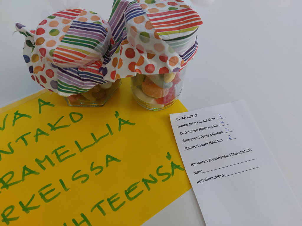 Kyyjärven seurakunnan pisteellä arvuuteltiin lapsuuskuvista seurakunnan työntekijöitä pappi-Tuulaa, diakonissa-Riittaa, suntio-Juhaa ja kanttori-Jounia. Arvauksia tuli 78 kappaletta ja aika moni niistä osui oikeaan. Virsikirja arvottiin kaikkien vastanneiden kesken ja sen voitti Merja Isoniemi.