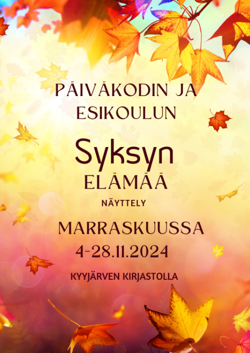 Tervetuloa tutustumaan ihanaan näyttelyyn, jossa syksyn väriloisto on hehkeimmillään. Näyttely on avoinna kirjaston palveluaikoina: