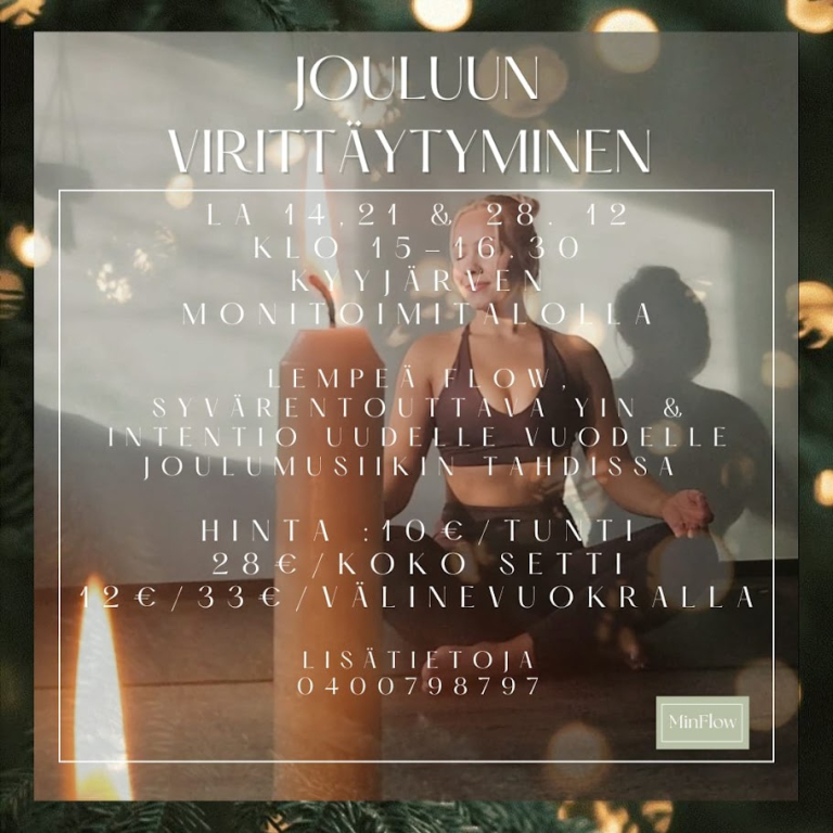 Jouluun virittäytyminen sisältää kolme erilaista joogatuntia, jotka sekä avaavat ja rauhoittavat. Tunnit liikutaan joululaulujen tahdissa.