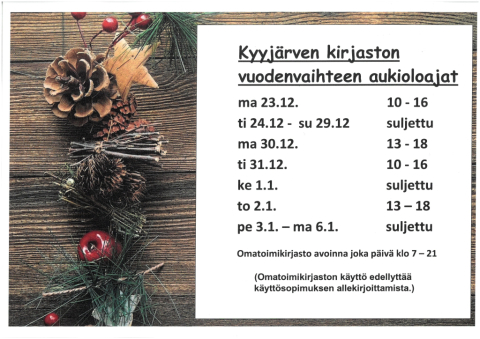 Vielä ehtii maanantaina 23.12. hakemaan joululukemista ja tekemistä! Lumikengätkin (3 paria) ovat taas lainattavissa.