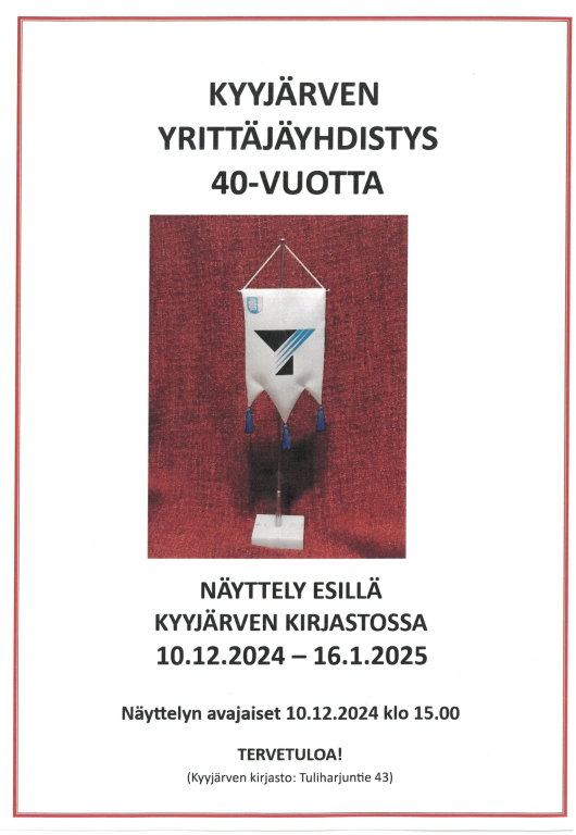 Kyyjärven Yrittäjät ry täyttää tänä vuonna kunnioitettavat 40-vuotta. Kyyjärven kirjastossa on esillä näyttely, jossa kerrotaan Kyyjärven Yrittäjien 40-vuotisesta taipaleesta.