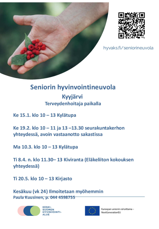 Hyvinvointi 15.01.2025 Kyyjärven kunta Minna Pitkänen Seniorin hyvinvointineuvolan kevään aikataulu Jaa sosiaalisessa mediassa Aihealueen yhteistyöyritykset
