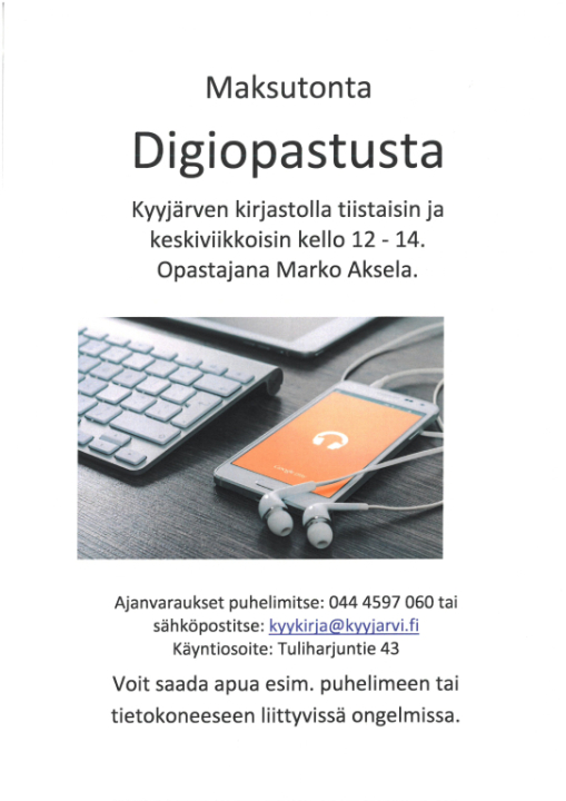 Digiopastusta on jälleen tarjolla tiistaisin ja keskiviikkoisin klo 12 - 14. Digiopastajana toimii Marko Aksela. Mikäli sinulla on ongelmia esim. puhelimen tai tietotekniikan kanssa, niin tämä maksuton palvelu kannattaa ehdottomasti hyödyntää. Ajan voit varata joko puhelimitse 044 4597060 tai sähköpostilla: kyykirja@kyyjarvi.fi. Opastus tapahtuu kirjaston tiloissa, osoitteessa Tuliharjuntie 43.