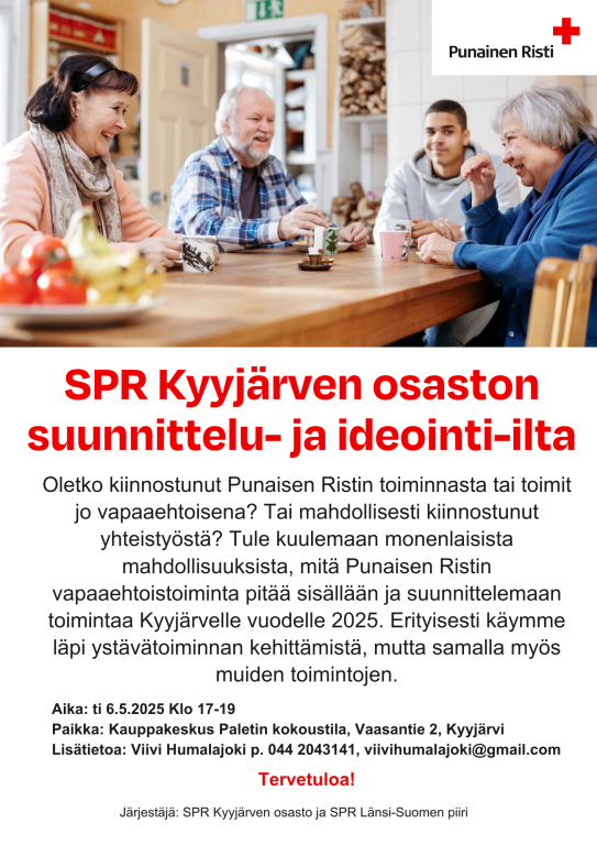Tule kuulemaan monenlaisista mahdollisuuksista, mitä Punaisen Ristin vapaaehtoistoiminta pitää sisällään ja suunnittelemaan toimintaa Kyyjärvelle vuodelle 2025. Erityisesti käymme läpi ystävätoiminnan kehittämistä, mutta samalla myös muiden toimintojen.