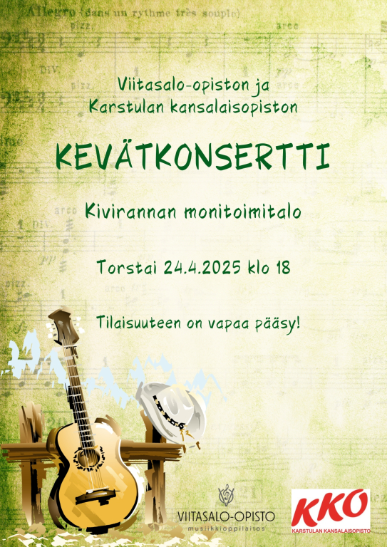 Kevät on saapunut ja lukuvuosi alkaa olla lopuillaan. Viitasalo-opiston ja Karstulan kansalaisopiston yhteisessä kevätkonsertissa päästään kuulemaan nuorien viulistien, kitaristien ja pianistien vuoden aherruksen tuloksia: muun muassa sitä, miten kevätsää lämmittää tai keinahdellen mennään veneretkelle. Kuullaan myös vanhoja hovitanssisävelmiä.