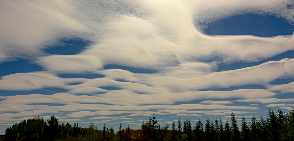 Vaikka tähtitaivasta ei vuoden valoisimpana aikana touko-kesäkuussa pysty havainnoimaan, riittää aktiiviselle luontokuvaajalle alkukesällä hyviä kohteita. Tämä on hyvää aikaa erilaisten pilvien ja auringon kuvaamiselle. Toukokuussa olen kuvannut hienoja mantelipilviä eli lentikulaareja, jotka näyttävät erehdyttävästi parvelta lentäviä lautasia. Ne syntyvät yleisimmin alkukesän voimakkaissa länsituulissa ilmamassan painautuessa Köli-vuoriston yli itään kohti Suomea. Myös komeat sateenkaaret näkyvät useimmiten alkukesällä sadekuurojen ja sivusta korkealta tulevan auringonvalon yhteisvaikutuksesta.