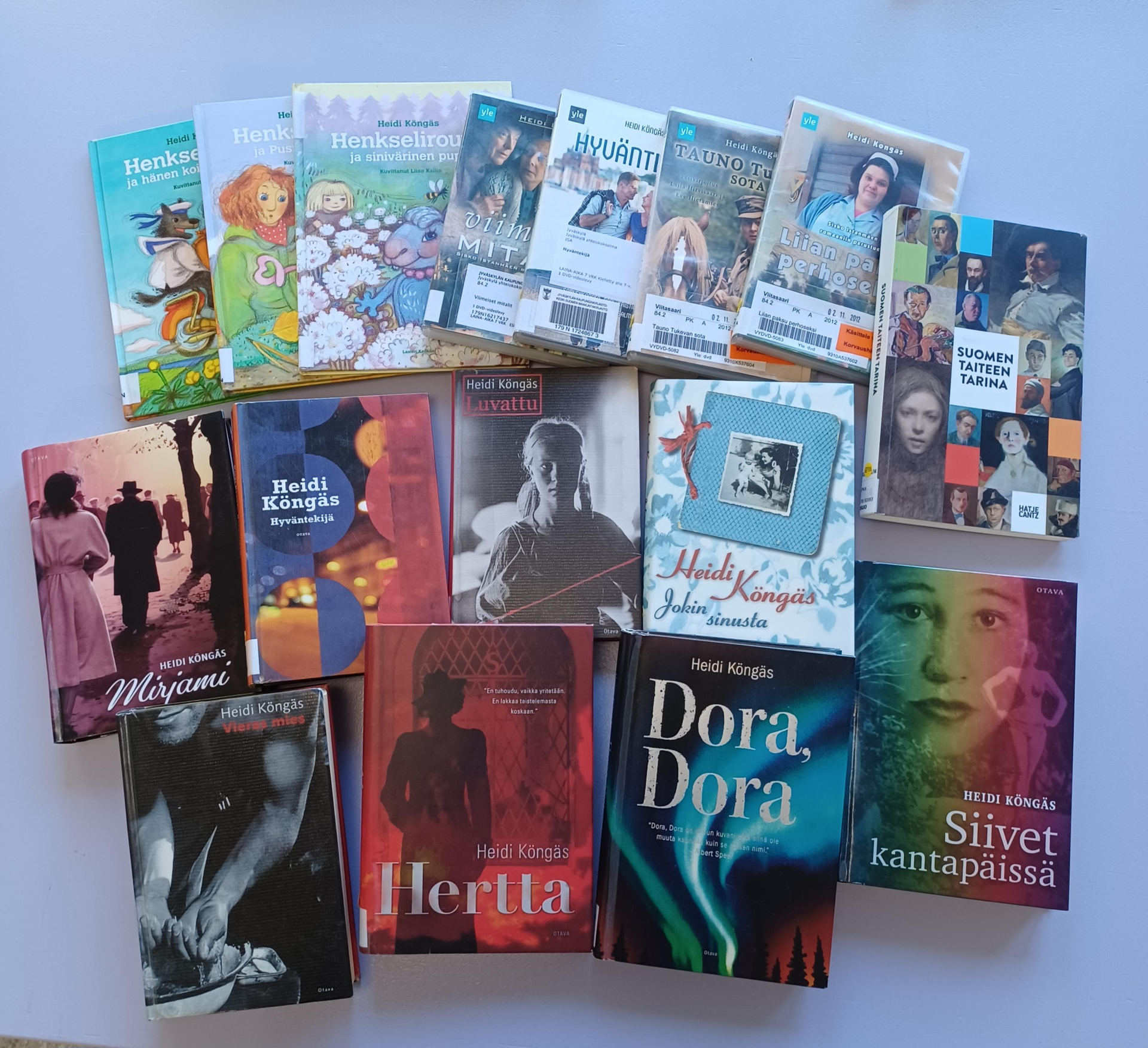 Heidi Köngäs on kirjoittanut kymmenen suosittua romaania, joista ensimmäinen on julkaistu vuonna 2000. Hän on kirjoittanut myös kolme lastenkirjaa. Hän on käsitellyt useassa kirjassaan perheensä historiaa. Köngäksen ensimmäinen kirja, Luvattu, oli Runeberg-palkintoehdokas ja 2012 julkaistu Dora, Dora oli Finlandia- palkintoehdokkaana.