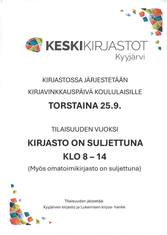 Kulttuuri 22.09.2025 Kyyjärven kunta Tiina Honkonen Poikkeus kirjaston aukiolossa Torstaina 25.9.-25 kirjastossa järjestetään kirjavinkkausta koululaisille. Tästä johtuen kirjasto on suljettuna klo 8-14. Myös omatoimikirjasto on tuolloin suljettuna. Jaa sosiaalisessa mediassa Aihealueen yhteistyöyritykset