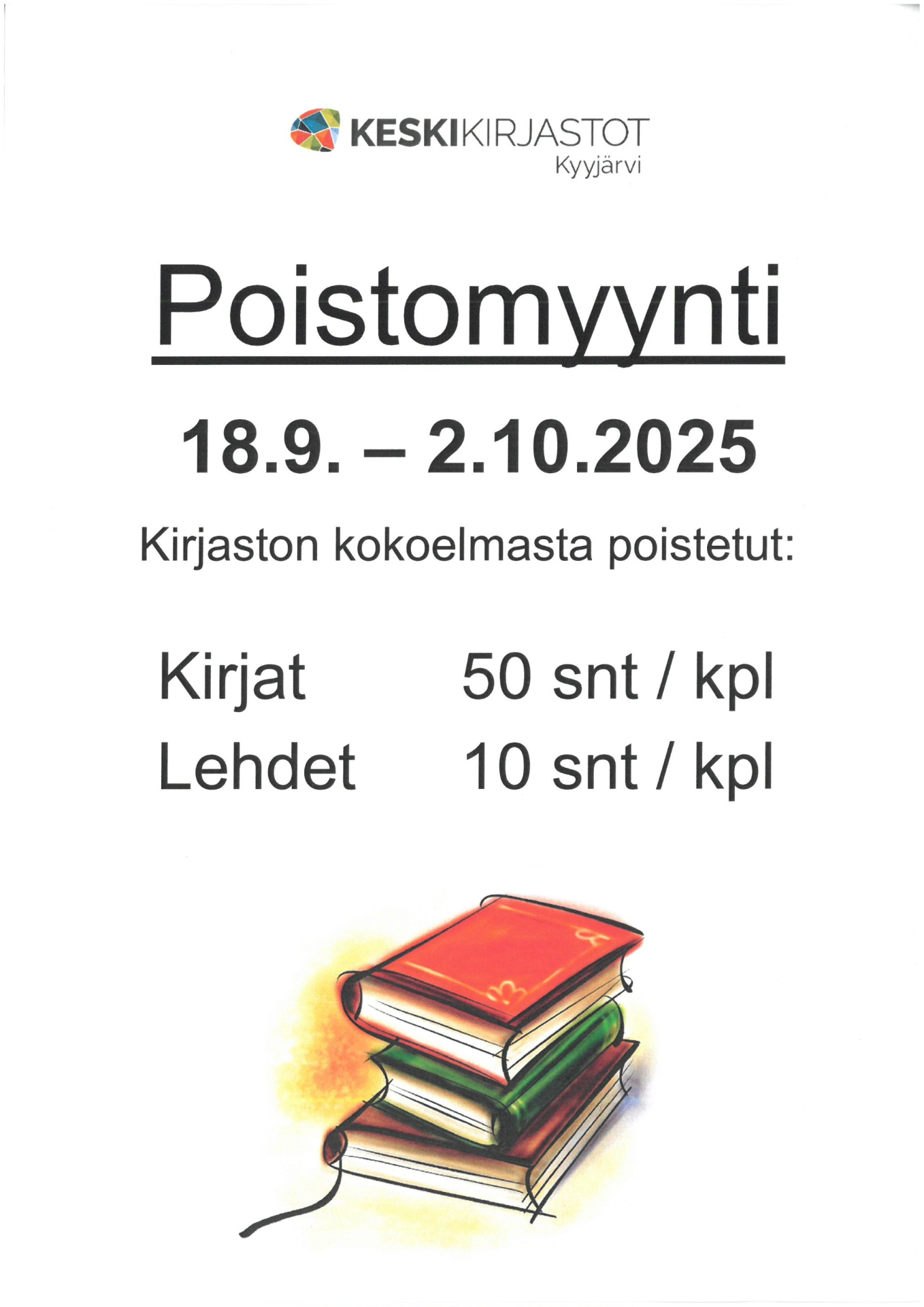 Kulttuuri 17.09.2025 Kyyjärven kunta Maarit Ohranen Poistomyynti kirjastossa Kirjaston kokoelmasta poistettua aineistoa myynnissä kirjastossa ajalla 18.9. - 2.10.2025. Tervetuloa tekemään löytöjä! Maksu käteisellä. Jaa sosiaalisessa mediassa Aihealueen yhteistyöyritykset
