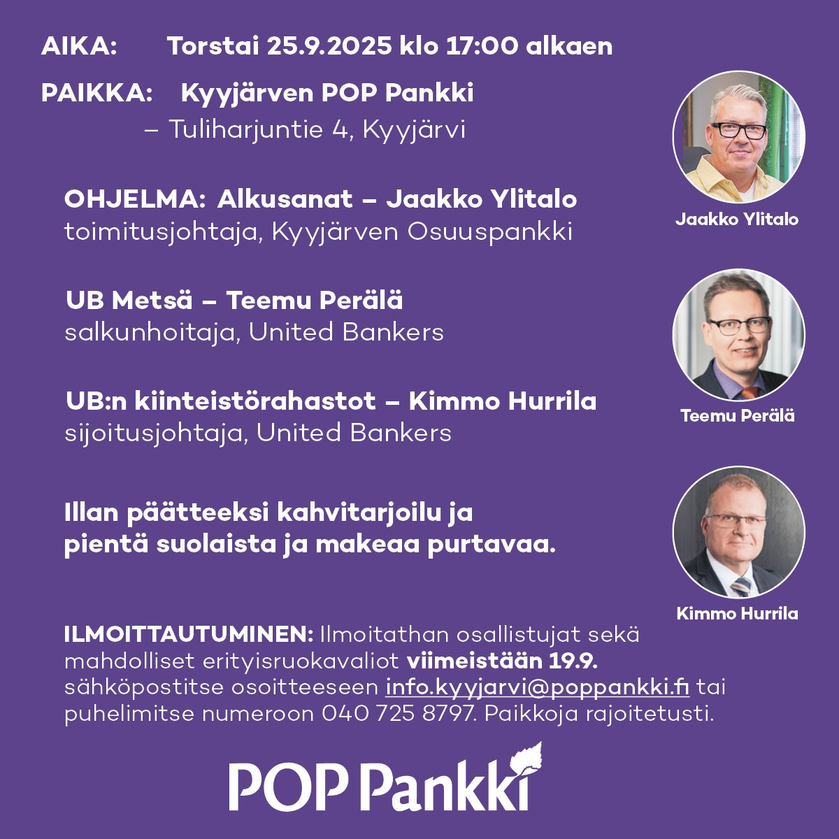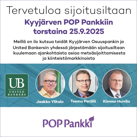 POP Pankki Kyyjärven Osuuspankki järjestää yhdessä United Bankersin kanssa sijoitusillan Kyyjärven konttorilla torstaina 25.09.2025 klo 17:00 alkaen.