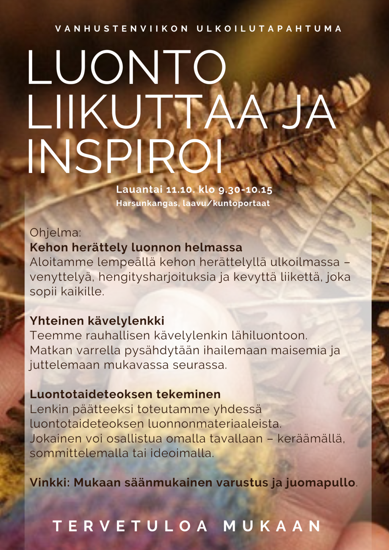 Seniorit 02.10.2025 Kyyjärven kunta Anne-Mari Hautala Luonto liikuttaa ja inspiroi - Vanhustenviikon ulkoilutapahtuma Harsunkankaalla la 11.10 klo 9.30-10.15 Tervetuloa mukaan Vanhustenviikon ulkoilutapahtumaan! Ohjelmassa lempeää liikuntaa luonnon helmassa! Jaa sosiaalisessa mediassa Aihealueen yhteistyöyritykset