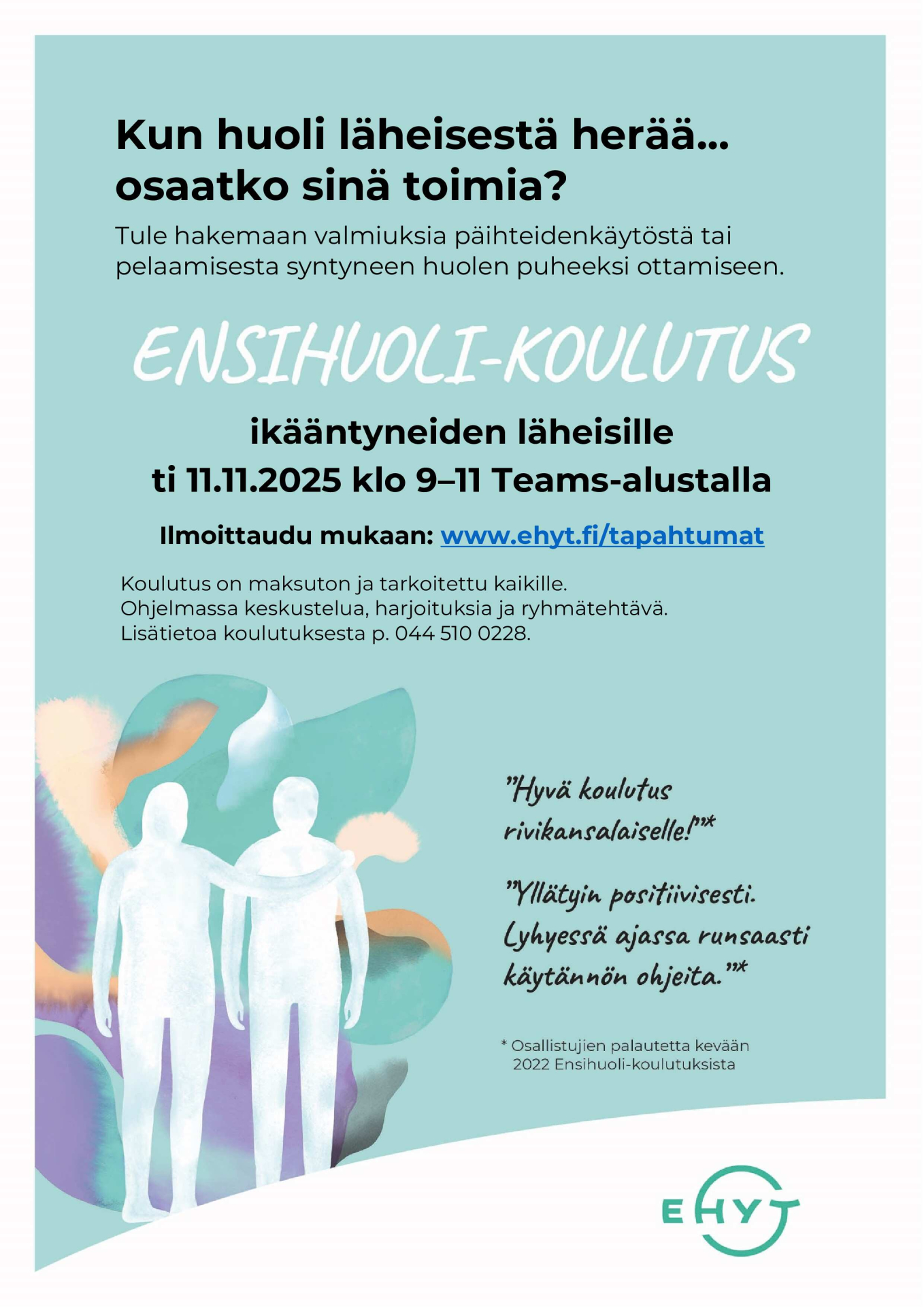 Ensihuoli-koulutuksessa opitaan puhumaan vaikeista asioista kunnioittavalla tavalla, toista rohkaisemalla ja tukemalla. Koulutus on maksuton ja tarkoitettu kaikille. Tämän koulutuksen kohderyhmänä ovat ikääntyneiden läheiset. Koulutus on tarkoitettu henkilöille, jotka kaipaavat välineitä päihteidenkäytön ja pelaamisen ja näistä syntyneen huolen kohtaamiseen ja puheeksiottoon ihmisenä ihmiselle. Lisäksi koulutukseen voivat osallistua kaikki, joita kiinnostaa mahdollisuus toisten auttamisesta ehkäisevän päihdetyön vapaaehtoistoiminnassa. Ensihuoli ei ole ammattilaiskoulutus.