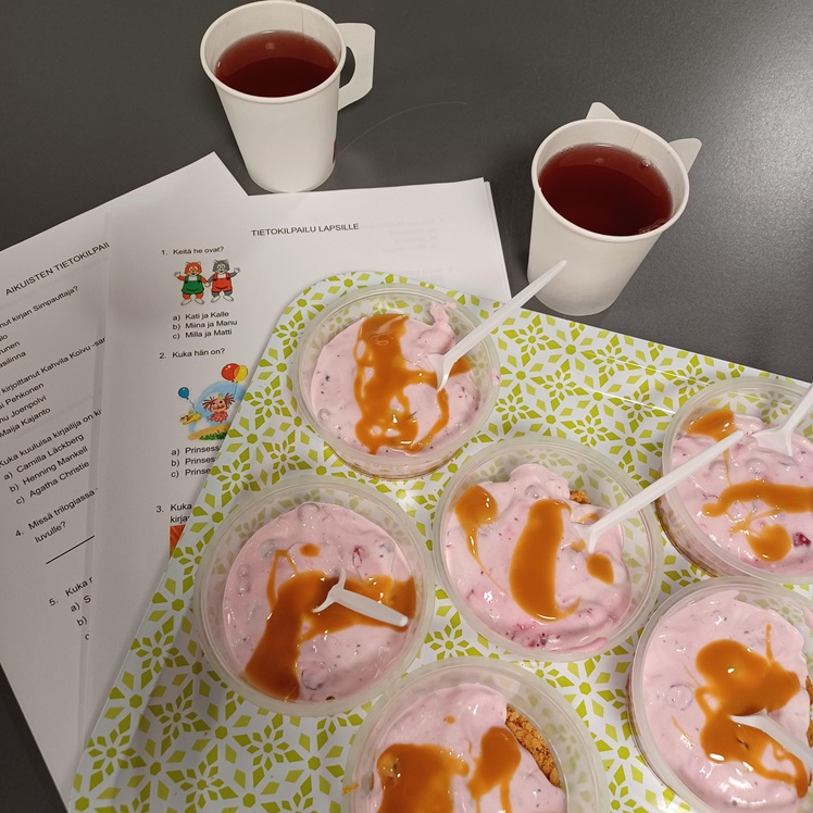 Pikkujoulutkin vietimme kirjastossa ennen joulua. Koko päivän oli tarjolla glögiä, rahkaa, joulunäyttely ja henkilökohtaista kirjavinkkausta. Aivonystyröitä sai verrytellä tietokilpailujen parissa. Olin tehnyt omat tietokilpailut aikuisille ja lapsille. Kuulemma vaikeat! Oikein mukava ja leppoisa tunnelma.