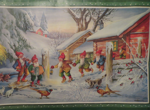 Äitillä riitti työtä valamistelussa. Meistä kersosta ei ollu vielä palijon apua. Navetasta tultua äiti rupes keittämään riisryynipuuroa. Puuron ku sai hautumaan, ni otti käsittellyyn oman mekontekeleen. Siinä oli vielä jottain neulottavvaa. Oma jäi aina viimeseks ku piti tehä koululaisille kuusjuhulamekkoja. Se sai mekon valamiiks ja laitto Tikka-konneen kannen alle. Minä sain tellätä kannelle joululiinan, jossa oli kuvia kynttilästä kuusen oksalla. Veli otti paperisen joulutaulun. Siinä oli tonttuja askareissaan ja elukoita kurkistelemassa nurkkapielistä. Se alako ripustammaan taulua seinälle, nous sängyn kannelle ja kiinnitti nastolla ratiohyllyn viereen.