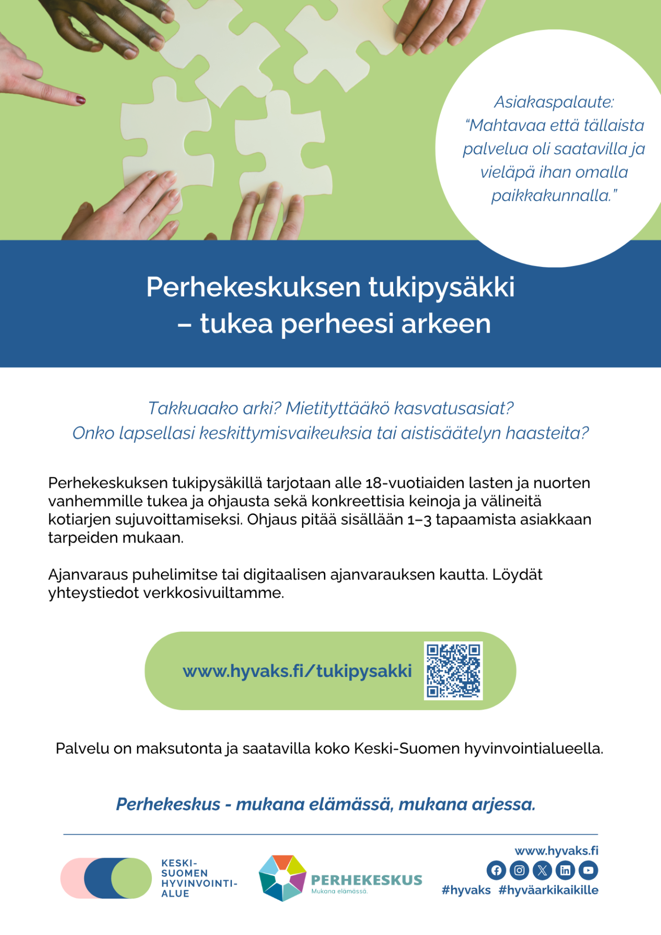 Hyvinvointi 21.01.2026 KESKI-SUOMEN HYVINVOINTIALUE Kyyjärven kunta Minna Pitkänen Perhekeskuksen tukipysäkki tarjoaa apua arkeesi! Jaa sosiaalisessa mediassa Aihealueen yhteistyöyritykset