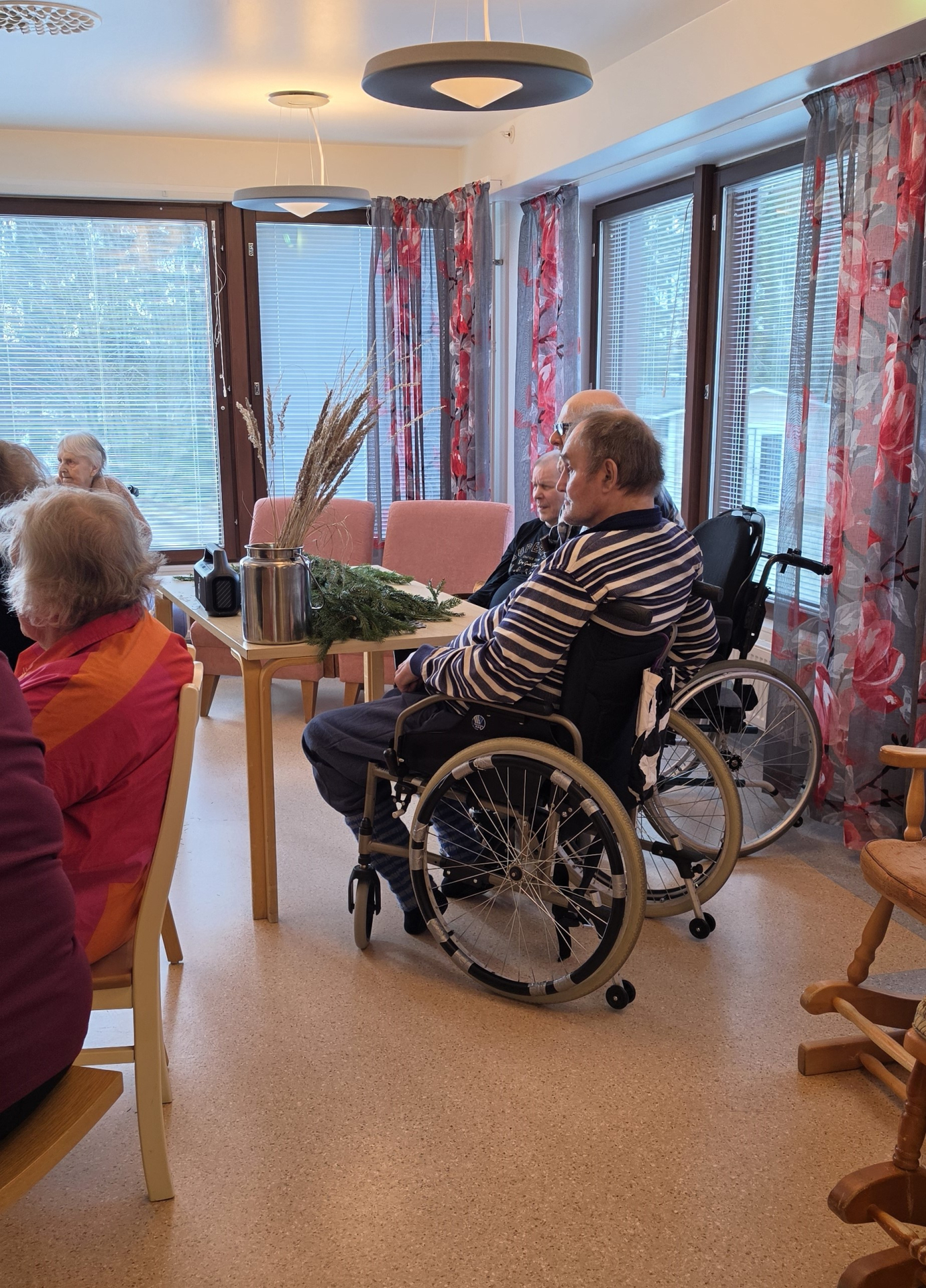 31.3.26 meillä kävi IkiOma Ikä ry pitämässä aistituokion. Aistituokiossa yhdistettiin virtuaalinen lyhytfilmi ja aistien aktivointi luonnonmateriaaleilla. Tunnelmaa tilaan luotiin lyhtyjen, heinien, kaislojen ja havujen avulla. Lyhytfilmissä lapset löysivät talven iloa maatilalta ja filmin aikana asukkaat pääsivät maistelemaan kauranjyviä, tuoksuttelemaan kuivaa heinää ja tunnustelemaan hevosen jouhia ja lampaan pehmeää villaa. Suu saatiin makeaksi Omar -karkeilla. Asukkaat olivat innoissaan tuokiosta, tuoksut ja maut olivat tuttuja ja toivat mieleen muistoja. Saattoipa tuokion myötä joku saada myös uusia aistielämyksiä.