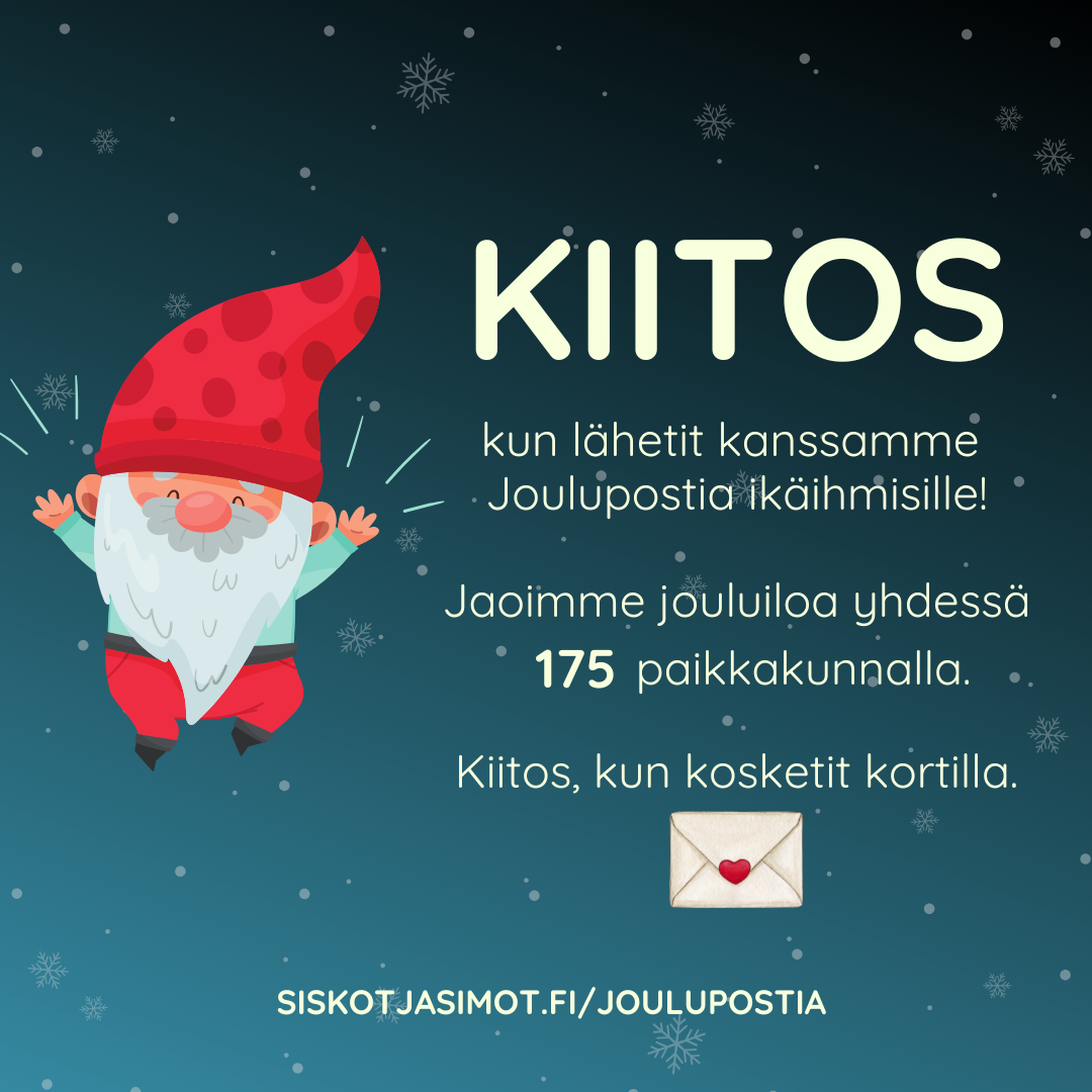 Lämmin kiitos kaikille kortin lähettäneille ja toiminnan organisointiin osallistuneille, kiittelee Siskot ja Simot ry:n toiminnanjohtaja Hanna Simola. Joulukortteja tehtiin kansalaisopistoissa, kirjastoissa, kouluissa, päiväkodeissa, työpaikoilla, harrastuksissa ja kodeissa. Korttikeräykseen osallistuivat kaikenikäiset, ja monelle perheelle tai yhteisölle osallistumisesta on tullut jo odotettu perinne. Joulupostia ikäihmisille -kampanjan yhteistyökumppaneita olivat paikkakuntien lisäksi Kuntaliitto, Kansalaisopistojen liitto, Kansalaisareena ja Tammenlehvän Perinneliitto.
