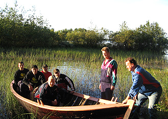 ![]() Laiva on lastattuKyyjärven vedenpinnan säännöstely teki tepposen veneen omistajalle. Huhtalan Osmo huomasi mitä saattaa tapahtua, kun vedenpintaa säännöstellään. Varmaan moni muukin veneen omistaja on tehnyt lähiaikoina saman havainnon. Eipä siinä muu auttanut kuin muistella hetkinen ketä on harrastuspuolella tullut avustettua ja muutaman puhelinsoiton jälkeen lentopallomiehet saapuivat "Kivipellon" Jukan niemenkärkeen. rohkein mies riisui tällä kertaa vain kengät ja sukat, pari kumpparimiestä Jannen kanssa veteen ja loput auttoivat rannalta käsin. |