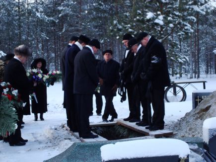 ![]() Taimi Kirvesmäki saateltiin haudan lepoonTaimi Kirvesmäki siunattiin viimeiselle matkalle lauantaina 18.12.2010 Kyyjärven kappelissa. Muistotilaisuus oli hautauksen jälkeen Kyyjärven kirkon seurakuntasalissa. Taimi Kirvesmäki e. Ohranen syntyi 30.12.1934 Saunakylän Lehtolassa Tyyne ja Oskari Ohrasen perheeseen. Hän varttui viiden sisaren ja kolmen veljen kanssa lapsuuskodissaan. Kansakoulun hän kävi Saunakylässä. Nuoruuden päivinä hän tutustui Kumpulan Lehtolasta olevaan Kirvesmäen Eeroon. Avioliittoon heidät vihittiin keväällä 1953. Vuonna 1954 hankittiin ensimmäinen yhteinen koti "Korpela" Kumpulasta. Eero kunnosti talon ja navetan. Heidän avioliitostaan syntyivät lapset: Anita ja Ari. Taimi hoiti lapsia, kotia ja karjaa. Eero kävi metsätöissä ja yhdessä tehtiin peltotöitä. Taimin ja Eeron haave uudesta kodista keskemmälle Kumpulan kylää toteutui, kun saatiin hankittua "Välilehdon" tila. Sinne rakennettiin uusi koti, joka valmistui vuonna 1982. Se tuntui 28 Korpelassa vietetyn vuoden jälkeen hienolta asialta. Eero laajensi navettaa ja näin voitiin elämää jatkaa entistä paremmissa merkeissä. Taimilla oli käden taidot ja ahkera mieli. Hän oli mukana Kumpulankylän kuorossa, jota seurakunnan kanttori veti. Taimi oli luonteeltaan vaatimaton, mutta lämminhenkinen. Sairauden myötä jouduttiin luopumaan karjasta ja Taimi toimi lastenhoitajana. Elämän viimeisiä vuosia sävytti sairaus, joka vähitellen vei voimia. Taimi nukkui pois äkillisesti tästä ajasta 9.12.2010. Äiti, puoliso ja mummo on jättänyt tyhjän paikan kotiinsa, mutta kiitollisen mielen läheisten sydämiin. Yli 57 vuotta oli yhteistä elämää Eero puolison kanssa. Taimia jäivät kaipaamaan puoliso, lapset, lastenlapset ja läheiset. Taimin siunasi khra Olavi Vallivaara Kyyjärven kappelissa ja kanttorina oli Minna Erkkilä. Läheiset kantoivat hänet kirkkomaahan ja peittivät haudan muistotilaisuuden jälkeen. Monien läheisten, ystävien ja kyläläisten laskema kukkakumpu jäi muistuttamaan rakkaan ihmisen kaipauksesta. Muistotilaisuudessa Kyyjärven kirkossa puhui kirkkoherra, adressit lukivat lastenlapset Vuokko ja Tarja sekä yhdessä laulettiin virsiä. |