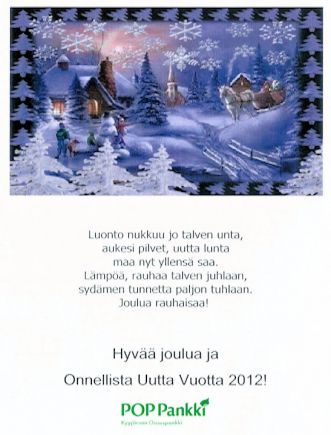 ![]() POP Pankin joulutervehdysHyvää Joulua ja Onnellista Uutta Vuotta 2012! POP Pankki Kyyjärven Osuuspankki |