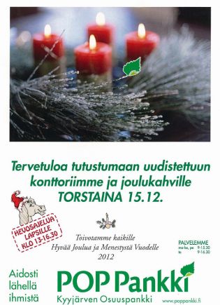 ![]() Osuuspankilla joulukahvitTervetuloa tutustumaan uudistettuun konttoriin ja joulukahville torstaina 15.12. Hevosajelua lapsille kello 13-16.30 |