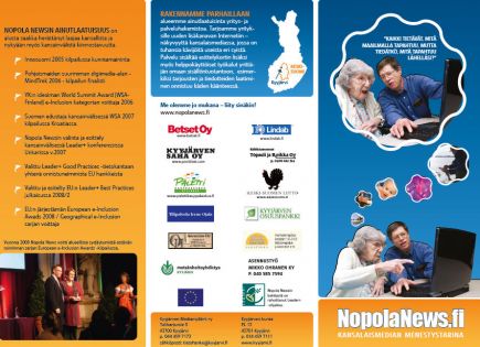 Palkintosumma on kilpailun sääntöjen mukaan hyödynnettävä kampanjoinnilla MTV3:lla, Helsingin Sanomissa sekä OtavaMedian välityksellä. 25 000 euron summa mahdollistaa niin alueellista kuin valtakunnallistakin näkyvyyttä. Nopola Newsin Yritykset ja Palvelut sivusto on näyttävästi katettu seutukunnan yrityksillä ja palveluntarjoajilla. Esitesivu korvaa hyvin pienen yrityksen nettisivun tarpeen. Eri aihealueilla on yritysten logoja, joista on tehty linkitys yrityksen kotisivulle, nettikauppaan tms. Etusivun Ostosvinkit & Tarjoukset painikkeen alta löytyvät helposti yritysten tiedotteet ja tarjoukset. Hinnastomme vuodelle 2011: Kannattaa olla näkyvillä Nopola Newsissä, markkinoimme sivustoa aamusta iltaan; joskus jopa yölläkin ja keväällä vielä näkyvämmin SM-palkinnon tuella. Juttujen teko Nopola Newsissä tapahtuu siten, että eri yhdistykset ja järjestöt nimeävät keskuudestaan tiedontuottajan. Näin tieto tulee sieltä missä se parhaiten tiedetään. Yrityspuolella juttujen teko kuuluisi mm. yrittäjäyhdistyksille, kunnalle ja mikseipä jollekin muullekin järjestölle. Mediamyllärit ovat resurssiensa puitteissa tehneet näitä yritysjuttuja omista yhteistyökumppaneistaan (kuntarajat eivät ole esteenä), koska tietona on, että kiireisillä yrittäjillä ei useinkaan riitä aikaa juttujen rustailuun. Lisäksi julkaisemme mielellämme julkaistavaksi sopivia juttuvinkkejä. Mediamylläreiden hallinnoima hanke Nopola News -Virtuaalisesti ja livenä toisena päätavoitteena on laajentuminen seutukunnalle. Tähän osioon hankkeesta paneudutaan todenteolla vuoden 2011 aikana. Hankkeesta tullaan tiedottamaan toisessa jutussa. Lukijoita tavoitamme kattavasti kansainvälisesti, maailmanlaajuisesti jopa 119:sta maasta ja kävijöitä on kaikkiaan ollut tähän asti lähes 10 miljoonaa. |