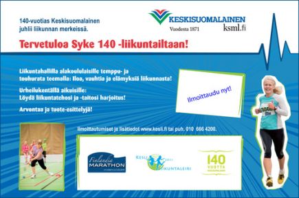 ![]() SYKE 140 -liikuntaillatOsana sanomalehti Keskisuomalaisen 140 v juhlavuotta Keski-Suomen Liikunta järjestää yhdeksässä Keski-Suomen kunnassa Syke 140 -liikuntaillan. Syke 140 -liikuntailta on toiminnallinen tapahtuma, jossa alakoululaisille järjestetään sisätiloissa temppu- ja touhurata teemalla iloa, vauhtia ja elämyksiä liikunnasta. Aikuisille järjestetään urheilukentällä löydä liikunta-tehosi ja –taitosi harjoitus. Harjoituksessa saat juoksun ja sauvakävelyn tekniikkaopetusta, vinkkejä oikean liikuntakuormituksen löytämiseen ja pidetään juoksijan jumppa