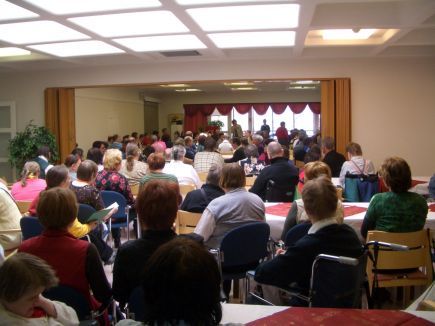 ![]() Kehitysvammaisten kirkkopäivää vietettiin KyyjärvelläTiistaina 13.5. kokoontui Kyyjärvelle iso joukko iloista väkeä koko Saarijärven rovastikunnan alueelta viettämään perinteistä kehitysvammaisten kirkkopäivää. Päivä aloitettiin messulla kirkossa. Kirkon ovella vieraita olivat vastaanottamassa ja tervetulleiksi toivottamassa Merja isoniemi ja Jukka Noponen, Marja-Leena Muhonen ja Kauko Aksela sekä Maria Paakkarinen ja Esa Noponen. Liturgina toimi oma kirkkoherramme Olavi Vallivaara ja saarnan piti kehitysvammatyön pastori Maarit Nuopponen. Hän kertoi ensimmäisen helluntain tapahtumista sekä siitä, miten Pyhä Henki nytkin vaikuttaa keskellämme. Kirkosta siirryttiin Kivirantaan lounaalle. Timo Lahden kaunis kattaus hiveli silmiä ja ruoka riitti hyvin, vaikka ruokailijoita oli yli 170! Loistavan talkoojoukon (Sisko Pillikko, Leena Salama, Anneli Pölkki, Riitta Lintulahti ja Maire Peuranen) avulla ruokailu sujui joutuisasti ja päästiin viettämään yhteistä keväistä juhlaa. Juhlassa oli hyvää ohjelmaa kaikista mukana olleista seurakunnista. Kyyjärviset Mirjami Noponen, Merja Isoniemi, Marja-Leena Muhonen, Maria Paakkarinen ja Kauko Aksela loivat tunnelmaa esittämällä keväisen runon. Runo- ja lauluesitysten välissä laulettiin yhdessä kevätlauluja ja pistettiinpä meidät välillä pumppaamaan ja jumppaamaankin niin, että meinasi hiki tulla. Lähtösanoissaan Maarit-pappi opetti meille ristinmerkin tekemisen ja toivotti kaikille siunattua kotimatkaa. Päivä päättyi kääretorttukahveihin. Kiitos kaikille mukana olleille ja siunattua kesää! Tavataan taas ensi keväänä yhtä isolla ja iloisella joukolla Kannonkoskella!