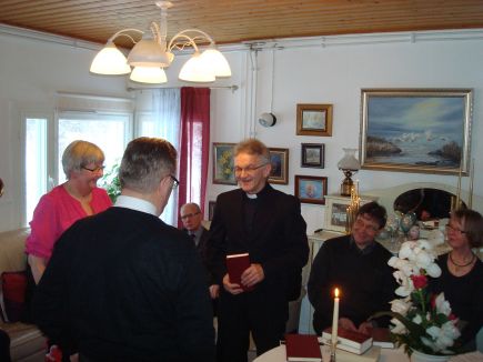 ![]() Väisäsen uudistettu koti siunattiinRaili ja Urho Väisäsen kodissa oli Kynttilänpäivänä juhlahetki. Koti siunattiin ja oli tupaantuliaiset. Kodin siunaamisen toimitti khra Olavi Vallivaara, kanttorina oli Minna Erkkilä ja kirkkokuoro lauloi. Kodin isäntä Urho Väisänen toimi tekstinlukijana ja lopuksi muisteli kodin rakentamiseen liittyneitä tapahtumia sekä kiitti ystäviä ja sukulaisia, jotka olivat saapuneet juhlaan. Johannes Leppänen muisteli yhteisiä työvuosia Urhon kanssa. Raili ja Urho Väisänen ovat asuneet vuodesta 1974 Kallio-ahon tilalla. Taloa ja ympäristöa on korjattu ja kohennettu. Viimeiseksi uudistettiin kotia sisältä ja lämpöjärjestelmä vaihdettiin. Kiitollinen mieli oli juhlahetkessä kaikesta ajallisesta aherruksesta, jotka Taivaan Isä on suonut toteutuvan. Siunaussanoissa kirkkoherra lausui: "Jumala on hyvyydessään antanut teille tämän kodin ja läheiset ihmiset. Siunatkoon kolmiyhteinen Jumala, Isä ja Poika ja Pyhä Henki tämän kodin ja kaikki, jotka täällä asuvat ja vierailevat." Väisäsen koti täyttyikin sukulaisista ja ystävistä. Onnea ja siunausta Railin ja Urhon uudistettuun kotiin! Kuvat: Juha Humalajoki |