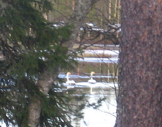 ![]() Kirvesjärvelle paluumuuttajiaTuttu näky Kirvesjärven pienellä puolella. Joutsen pariskunta on saapunut taas kerran kesänviettoon. Joutsenethan pariutuvat iäksi ja ne ovat uskollisia pesimäjärvelleen. Nyt järvellä on paljon lunta ja sulaa juuri ja juuri, jotta joutsenet mahtuivat uinumaan. Pitkät kaulat loistivat ylväinä lumenkeskellä joutsenten viettäessä päiväsiestaansa. Galleriakuvan katsomalla näet minkälaisissa maisemissa Saunakylällä eletään huhtikuun 7. päivänä vuonna 2006. |
