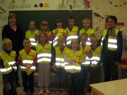 Eliisa Löytönen ja Heljä Turpeinen kävi maanantaina luovuttamassa Betset Oy:n lahjoittamat turvaliivit eskarilaisille ja koulun henkilökunnalle. Heidän toiveena olikin, että liiviä käytettäisiin liikenteessä ja näin turvattaisiin turvallinen liikkuminen pimeälläkin.