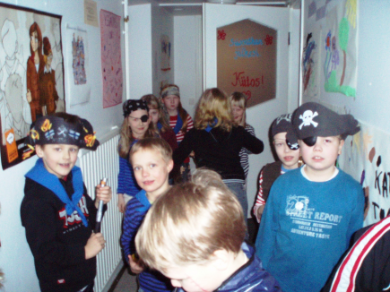 ![]() Merirosvot KaribianmerelläKapteeni Mustaparta ja Kalle Kierosilmä veivät 15 merirosvoalokasta laivaan ja matka alkoi. Laivaan päästäkseen oli näytettävä hieman merirosvolta. Ja paikka laivasta irtosi vain kiiltävällä timantilla. Rohkeus oli näytettävä kaivamalla timantti erään entisen merirosvon vielä lämpimästä vatsalaukusta. Se ei tuottanut lainkaan ongelmia, niin karskeja rosvoja oli merelle lähdössä. Laivassa odotti itse Kapteeni Mustaparta ja alokkailla alkoi varsin kova komento. Matkalle saarelle hän kertoi meille erilaisista kidutuskeinoista. Salainen kirjekäärö luetaan. Kalle Kierosilmälle purjehtiminen ei ollut oikein tuttua, ainakaaan ei tiennyt kummasta päästä laivaa ohjattiin. Enemmän oli Kallella äitiä ja vähän tuttiakin ikävä! Merellä nautittiin huikopalana juuri leikattuja sormia ja dippi oli sellaista verenpunaista... Ja kuten tiedätte laivalla voi tulla helposti merisairaaksi ja pahoinvointi voi yllättää. Niin nytkin, mutta onneksi vain yksi alokas puklasi, ja häntäkään emme heittäneet yli laidan. Vihdoinkin oli maata näkyvissä ja sai turvallisen maankamaran jalkojen alle. Rannoilla oli kuitenkin krokotiilejä ja käärmeitä. Simpukan kuoriin oli kätkettynä jokin messengeri. Ja kuten tiedätte, kaikki rosvot eivät ole kiinnostuneita ääkkösistä. Viestistä saatiin kuitenkin selville että oikeaa avainta kultaiseen arkkuun pitäisi etsiä. Joku viisas alokas osasi heti päätellä ettei datsunin avain arkun lukkoon sopisi... Monta avainta piti koettaa, mutta viimein kaikkein pienimmällä avaimella arkun lukko aukesi. Kallella oli tilanteeseen sopiva laulunpätkä, mutta jostain syystä se ei kuulijoihin uponnut. No mitä nyt aina sellaisista aarrearkuista sitten löytyy? Joku vanha luunpätkä merenkävijän jalasta, vanhaa espanjan rahaa ja köyttä. Aina vaan köyttä. Onneksi oli paluumatkalle edes yhdet lakut. Apua, kello lyö pian seitsemän kertaa. Äkkiä laivaan kotimatkalle. Alokkaat tatuoidaan tietysti kyyn kuvalla ja vielä lopuksi sisaruspiiri. Tunnin aikamatka Karibialle on ohitse. Eteisessä merirosvoalokkaat pukevat toppaa ylle kotimatkalle. Kalle jakaa ilmoittautumislappua talviretkelle Harsu 007:lle. Kuuluu hämmästynyt ääni: mitä? Tuleeks sinne Bondikin. Siistiä. |