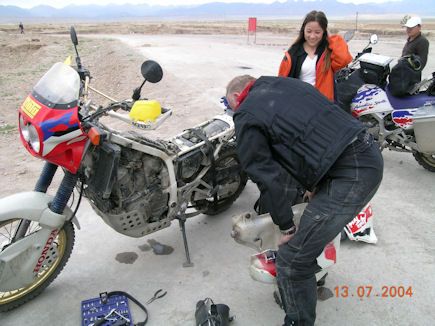 ![]() Moottoripyörällä Tiipetiin (23)Seuraavalla huotoasemalla minun AT:n bensaletku alkoi vuotamaan, siihen oli tullut reikä. Tämän onneksi huomasi paikalla ollut pieni tyttö, osoitti minulle sormella vuotopaikkaa ja kertoi jotain Kiinaksi. Verran hieno ele, että hän sai siitä minulta isän päiväpalkan verran Juania taskuunsa. Samalle asemalle saapui Pekingiläinen ryhmä suurella maastoautolla matkalla Tiipettiin ja meidät huomatessamme sanoivat, ’you are our heros’. Kai sitä sitten olitiin jonkinlaisia ’heroja’ heidän mielestään, oli mitä oli mutta se tuntui ihan hyvältä. Ilalla saavuttiin Xining:iin ja hotellin löytämisessä oli hieman ongelmia. Halusimme siihen hotelliin jossa yleensä olemme olleet mutta sen löytäminen ei ollutkaan niin yksinkertaista kuin olimme olettaneet. Tunnin kaupunkiajelun jälkeen hotelli löytyi, kamat sisään ja matkaoluille. Oli satanut monta tuntia ja pintaveden poistosysteemi kaupungissa ei ollut joka paikassa asiallisessa kunnossa. Yhden sillan alla oli vettä niin paljon, että piti oikein miettiä missä kohtaa imuilman aukko on ettei vain pääsisi vettä koneeseen syvää lammikkoa ylittäessä. Aamulla Xining jäi taakse ja päivän kohde oli jo tutuksi tullut Yinchuan, motoristikaupunki Ningxia:n provinsissa. Noin sata kilometriä ennen Yinchuan:ia aurinko laski ja tie oli täynnä kaikennäköistä kulkijaa. Oli puintiaika ja monesti täysin valoton hervesteri tukki tien. Kun on hieman hämäräsokeutta niin tämä viimeinen pätkä ei ollut kovinkaan mieleen. Kun pääsimme vihdoin Yinchuan:iin niin liikennevaloissa tapasimme yhden paikallisen motoristin joka oli matkassa Hayabusa:lla. Pyysin häntä ohjaamaan meidät Hong Jian hotelliin ja hetken päästä olimmekin siellä. Oli Jarin synttäripäivä ja Guntherin kanssa tarjosimme hänelle lahjan joka oli varmaankin miehen mieleen. Gunther:n BMW:n jarrupalat olivat lähestulkoon lopussa. Jarrupaloista olimme kysyneet Hajabusa:n kuskilta ja hän sanoi, että tulee aamulla hotelliin ja sitten ajetaan paikkaan jossa palat voi vaihtaa. Oikeita paloja ei kumminkaan löytynyt mutta paikalliset kaverit tekivät sellaiset palat jotka saatiin asennettua paikalleen. |