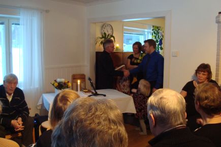 ![]() Teija ja Eino Nissisen koti siunattiinSunnuntaina 17.2.2013 vietettiin juhlaa Kyyjärven Rajamaalla, kun Teija ja Eino Nissisen uusi koti siunattiin. Perheenisä Eino Nissinen toivotti tupaantuliaisvieraat tervetulleeksi ja iloitsi, kun väkeä oli paikalla "tuvan täydeltä". Kodin siunauksen toimitti khra Olavi Vallivaara, joka puheessaan tarkasteli kodin merkitystä meille ihmisille. Ajallinen koti on suuri Jumalan lahja ja vielä suurempi lahja ovat kodin jäsenet. Kodin elämään liittyy vaiva ja ilo, työ ja siunaus. Onnellinen koti on se, jossa saa tuntea hyväksyntää. Viimeisenä sanana saa heikoinkin kuulla kodin kurkihirren alla, että synnit saa uskoa anteeksi Jeesuksen nimessä ja veressä. Kodin siunaussanat kuuluivat: "Jumalan sanan mukaan sillä, minkä Herra siunaa, on aina oleva siunaus. Tähän luottaen siunaan tämän kodin Isän ja Pojan ja Pyhän Hengen nimeen. Olkoon tämä koti paikka, jossa kysytään ja seurataan Jumalan tahtoa. Vallitkoon teidän sydämissänne Kristuksen rakkaus." Yhdessä laulettiin kanttorin johdolla virsiä ja nautittiin tupaantuliaistarjoilusta. Toivotamme Teija ja Eino Nissisen uuteen kotiin ja kaikille perheenjäsenille Onnea ja Taivaan Isän siunausta! Kuvat: Juha Humalajoki |