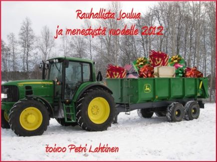 ![]() Petri Lahtisen jouluterveisetPetri Lahtinen Kyyjärveltä kiittää yhteistyökumppaneitaan kuluneesta vuodesta. Toivottaa kaikille yhteistyökumppaneille, sukulaisille ja ystäville oikein hyvää joulunaikaa sekä menestyksellistä uutta vuotta 2012! |