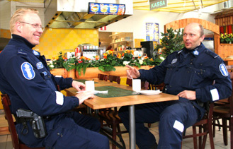 ![]() Poliisin turvalaitekampanja käynnistyiTänään käynnistyi poliisin Turvalaitekampanja taajama-alueilla. Kampanjan kesto on 7.4 - 9.4. Poliisin mukaan erityistä huomiota kiinnitetään turvavöiden käyttöön, taajamanopeuksiin ja varsinkin ilta-aikaan puhallutetaan. Tämä kaikki tehdään ihmisten turvallisuuden puolesta huolimatta poliisin vähäisistä henkilöstöresursseista. Saarijärven kihlakunnan poliisit Jouni Rinne ja Jari Nuppola olivat kahvitauolla Paletissa. Kyyjärvi on keskeisen sijaintinsa vuoksi oiva paikka myös poliisin taukopaikaksi. Paletti sopii hyvin päivävuorolaisille ja Shell yövuorolaisille. Poliisin näkyvyydellä on oma vaikutuksensa yleiseen ilmapiiriin ja kouluilla vierailutkin perustuvat suurelta osin näkyvyyden lisäämiseen, toki tietoa ja valistusta jaetaan mielellään. Saarijärvi työllistää poliisia pääosin iltaisin ja viikonloppuisin, muitakaan kihlakunnan alueeseen kuuluvia kuntia kuitenkaan unohtamatta. Renkaiden vaihtoa he kommentoivat, että on parempi vaihtaa kesäkumit alle liian myöhään kuin aikaisin. Juhannuksen tietämillä varmasti puututaan talvirenkailla ajelemiseen. Rengasasiat riippuvat paljon tieolosuhteista. Raitilta kuultua: