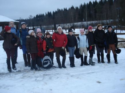 ![]() Heppakerhon retki Takalan tallilleHetkeksi vielä joulukuisiin tunnelmiin. Ei sentään tonttutyttöjä, vaan tallityttöjä... Kauan odotettu retki-lauantai koitti sitten vihdoin ja viimein. Linja-auto starttasi kohti Veteliä ja Takalan tallia. Päivä oli - onneksi- kohtalaisen lämmin, joulukuun 13. Voi niitä lasten onnellisia hymyjä. Ja jännittikin niin maan perusteellisen paljon! Menomatkalla mietittiin ratsastuskoulu-termejä, rata pituussuuntaan leikkaa, kokorata leikkaa, oliko se nyt pitkin vai poikin vai sama asia, apua! Paikan päälle päästyämme kuului haikeita huokauksia ja vaikka vastaan olisi loikkinut kirppuinen takkutukka-hevonen, olisi sekin saanut ihailevia katseita; voi, kato ku toi on IIIIhana! (tosin hevoset olivat oikeasti iiihania...) Niina-ope jakoi ryhmät ja hevoset ja ensimmäisenä pääsivät ratsaille talutettavat. Ympäri kenttää, vähän jumppasivat ja harjoittelivat pysähdyksiä ja liikkeelle lähtöä. Ja ravasivat! Hienosti tyttäret muistivat mikä ero on harjoitus -ja kevyellä ravilla. Isommat saivat sitten kahdessa eri ryhmässä harjoitella ravinnostoja ja edistyneempien juttuja. Ja tietenkin sitä iki-ihanaa laukkaa. Jenna ja minä söimme kyntemme ja puolet lapasista kun jänskättiin kentän laidalla että nouseeko se laukka. Ja laukkahan nousi! Kiitos taitavan opettajan. Onnistuneen iltapäivän jälkeen kotimatkalle lähti joukko onnellisia neitejä, varpaat ja nenä jäässä, nälissään, hevoselta tuoksahtaen, sitä on heppahöperön onni! Heppakerho jää nyt ainakin kevään ajaksi tauolle. Katsotaan jos jonkinlaista kurssipäivää tai vastaavaa saataisiin kuitenkin vielä järjestettyä. Kiitos tytöt, kivaa oli! |