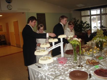 ![]() Kyyjärven pojat hakivat vaimot PerhostaKyyjärviset nuoret miehet saivat siis vaimot Perholaisista sisaruksista kun Jenni Johanna Humalajoki ja Valtter Henrik Noponen sekä Elisa Annastiina Humalajoki ja Paavo Juhani Sauramäki vihittiin kristilliseen avioliittoon lauantaina 28.3.2009 Perhon kirkossa. Vihkimisen toimitti Kyyjärven vs. kirkkoherra Jari Kuusi. Runsas läheisten, sukulaisten ja ystävien joukko oli todistamassa kahden parin muutamien vuosien mittaisen seurustelun päätymistä avioliiton solmimiseen kotoisessa Perhon kirkossa. |