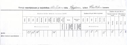 ![]() Kaavakkeita täytettiin ennenkinMaanviljelijät täyttivät tilastokaavakkeita 1900 luvun alussakin. Mäntysen Erkki toi Myllylle kaavakkeen, johon oli kirjattu tietoja maanviljelyksestä ja karjanhoidosta Mäntyniemen tilalta Kyyjärven kylässä Karstulan kunnassa. Kaavakkeeseen tilastoitiin sadon koko määrä vuonna 1908. Emätilan tiedot erikseen ja siihen kuuluvat maanviljelykset erikseen. Vehnää, rukiita, ohria, kauroja, sekaviljaa, tattaria, herneitä ja papuja, potaattia, nauriita ja juurikasveja, kehruukasveja,heinää sekä niistä kylvöheinän määrä. Määrät oli merkittävä hehtolitroittain tai kilogrammoina, kuormalukuna ja sen mainittu luku vastaava painoltaan kilogrammoina, kuormaluku sekä sen mainittu vastaava luku painoltaan kilogrammoina. Kesäkuun 25 p:nä 1909 kylvössä olevat viljalajikkeet oli kaavakkeeseen laitettava hehtolitroittain. Eläimet oli myös mainittava. Montako oriita, tammoja, ruunia, sonneja ja lehmiä talossa oli 25. kesäkuuta 1909. Kaavakkeen täytön ohjeistus: |