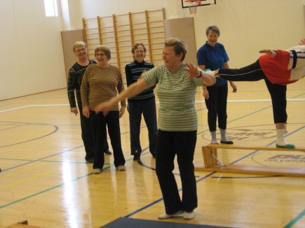 Ikäihmisten jumppaporukka jatkaa liikkumista vertaisohjaajien vetäminä kesälläkin. |