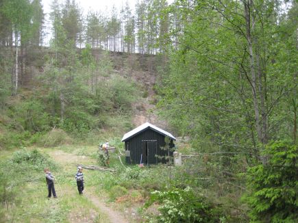 Hiekkamontun pohjalle ja reunoille oli kasvanut vuosien kuluessa paljon pajukkoa,lepikkoa ja koivikkoa.Tusina touhukkaita Oikarin vesiosuuskunnan jäseniä raivasi alueen ripeästi talkoilla. Hyttysiä ja mäkäräisiä oli suojaisessa notkossa runsaasti ja hikikin tuli, mutta ei ne tahtia haitanneet! |