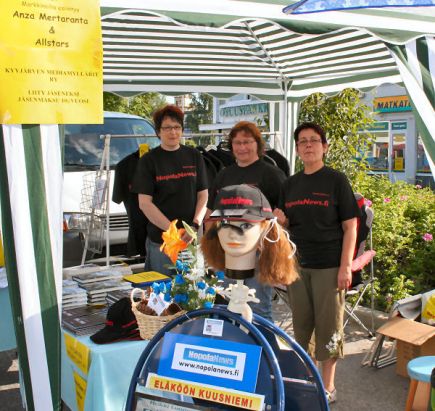 ![]() Viitasaaren markkinoillaKyyjärven mediamyllärit harjoittivat keskitettyä markkinointia Viitasaaren Wilma markkinoilla lauantaina 27.6. Nopola Newsiä olivat esittelemässä Alina Nieminen, Pirkko Kotanen, Irma ja Hannu Mäkelä. Yllä olevan kuvan otti Hannu ja loput minä. Markkinapäivänä oli lähes 30 asteen helle. Onneksi Kalliojärven Hannu antoi matkaan puutarhakatoksen, jotta ei ihan paistuttu vereslihalle. Parturi-kampaamo Helenalta saimme rupeli-lippikseen kauniin pään malliksi. Rupeli ei hyytynyt auringossa, pyöriä huruutti koko päivän. Villiviinin Anitalta saimme telineen johon rekvisiittamme tehtiin: Avot – hyvä tuli. Kiitokset jokaiselle. Markkinoilla oli toista sataa myyntikojua ja markkinaväkeä oli varmaankin tuhansia. Markkinoilla kun ollaan niin tarttuihan siellä väkisinkin jotain kotiin viemistä. Syksyllä sitä tepastellaan sitten kuvausmatkoilla Sievin kengät jalassa. Markkinoilla oli esittelemässä tuotteitaan Suomen ainoa parfymööri Max Perttula avustajanaan Jenni Siltanen. Max Joacimin sivustolta löytyy parfymöörin tuotteista enemmän tietoa http://www.maxjoacim.com/. Zeni parfyymi on lanseerattu v. 2005. joka on Maxin ensimmäinen suomalainen nimikkotuoksu. Jennillä on kauneus- ja viihdealan ohjelmatoimisto Helsingissä http://www.zenis.fi/ sivustolta löytyy Jennistä tietoa. Max antoi Myllyllä kävijöiden aistittavaksi hajuaistia kihelmöivän kevyen, hienostuneen ja kesäisen tuoksun Finlande No.1. Käykääpä Myllyllä tuoksua tupsauttamassa, samalla reissulla voi ostaa vaikkapa Takasen Ollin upean Luomu & Tila kirjan. |